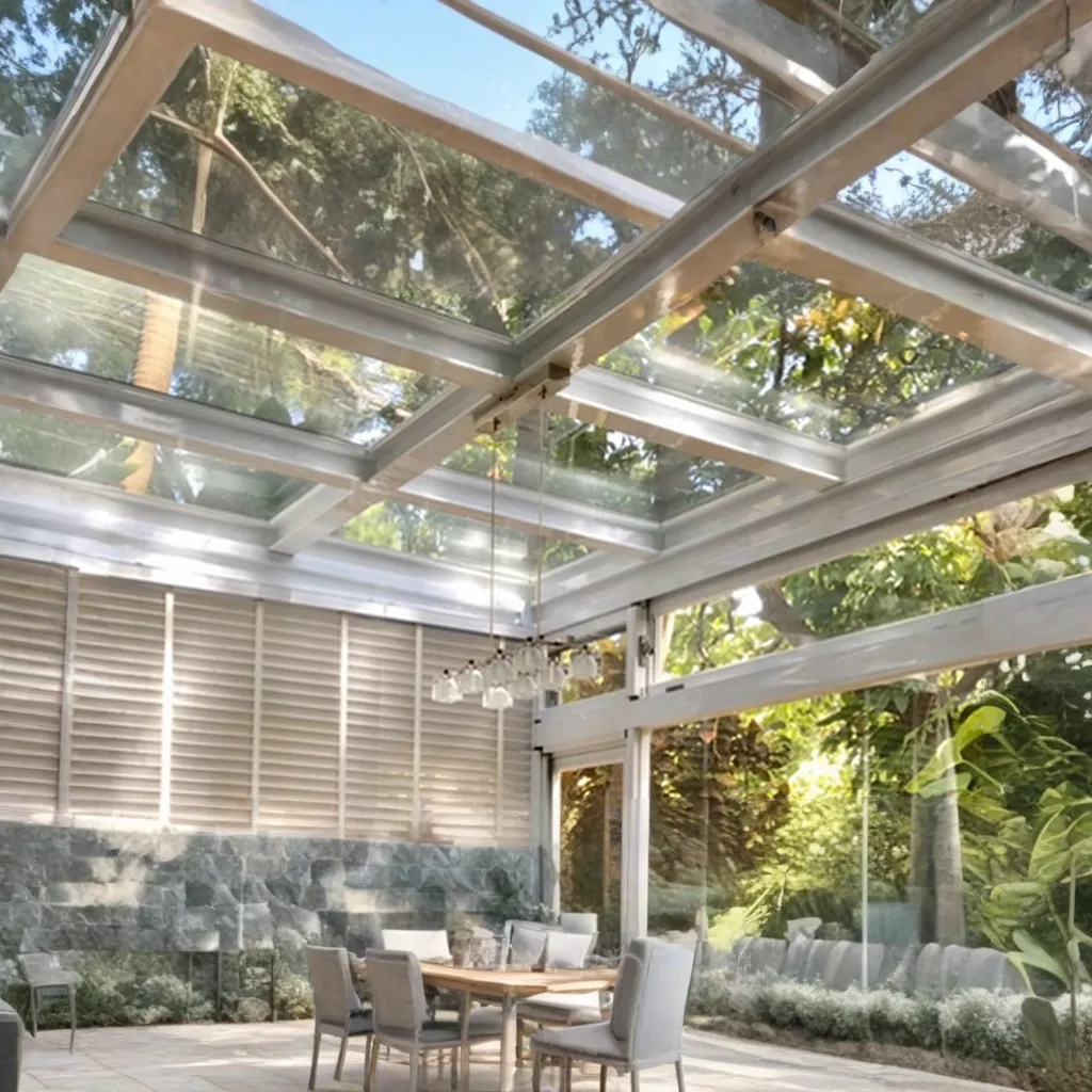 美觀穩定、透光度高,視覺感乾淨清透,適合講究質感的建築。不過重量較重,安裝時需搭配安全結構,並建議選用膠合玻璃確保安全性。